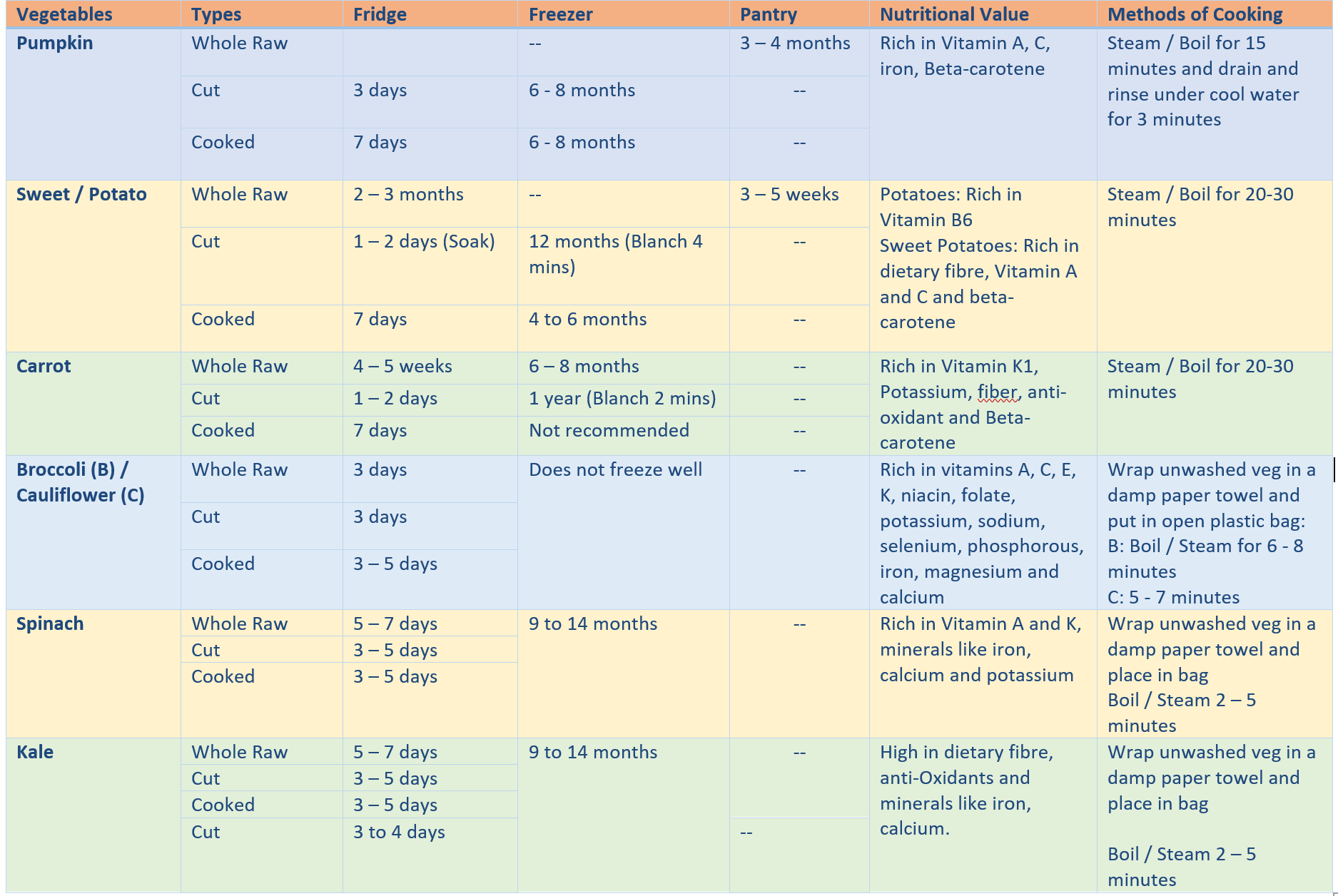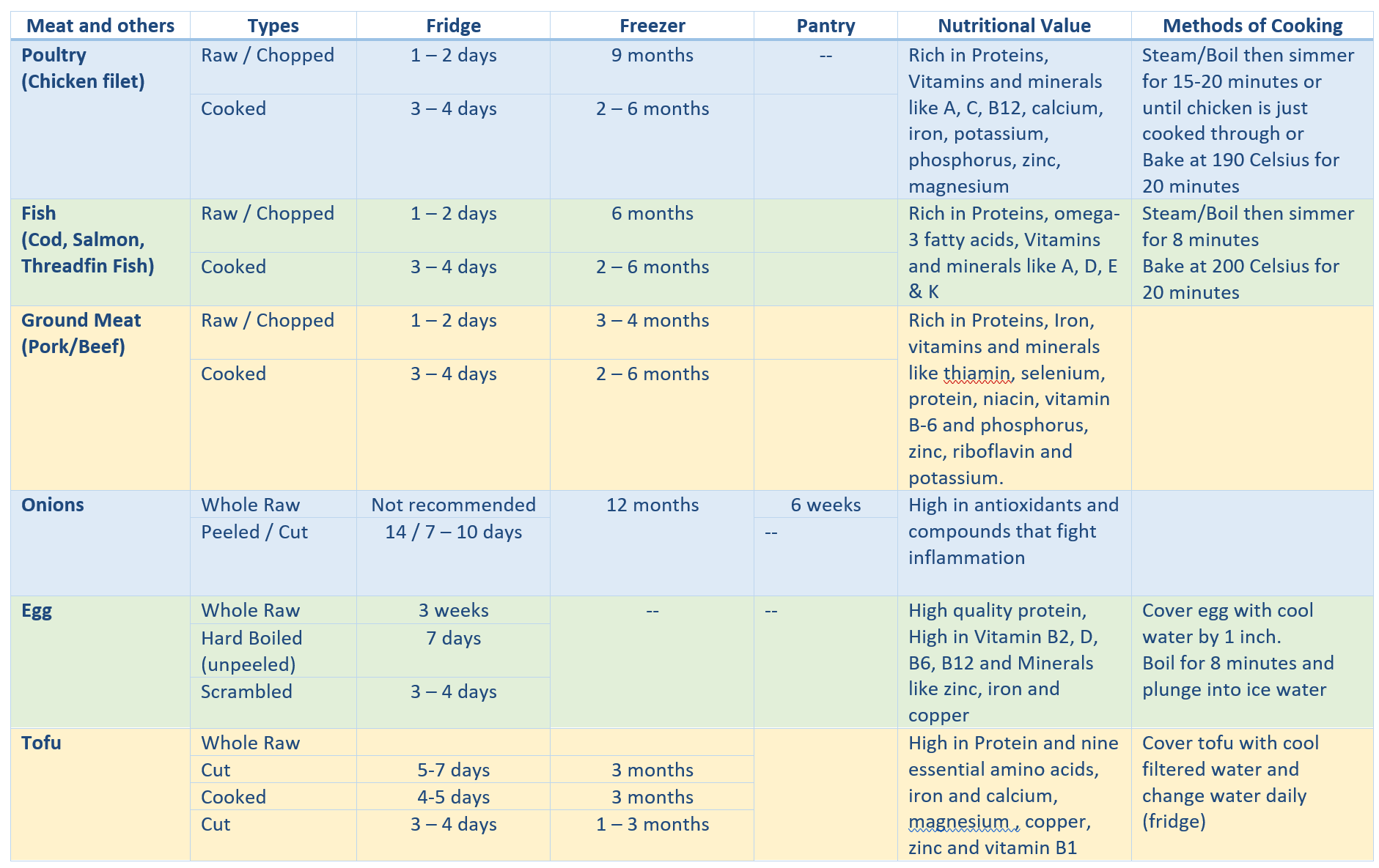 Meal Preparation means that I need to be aware of the storage life of the common ingredients I am using and the proper way of freezing. I have extracted the information from various sources (e.g. eatbydate.com, thespruceeat and healthline, National Center for Home Food Preservation to name a few) and consolidated it in a table for easy reference. I am totally clueless about cooking prior to this so the information helps me (seasoned chef, please feel free to enlighten me if you see anything wrong stuff here). However, I’m not sure how accurate the information is so please always do a smell and visual check before using the ingredients for cooking.
