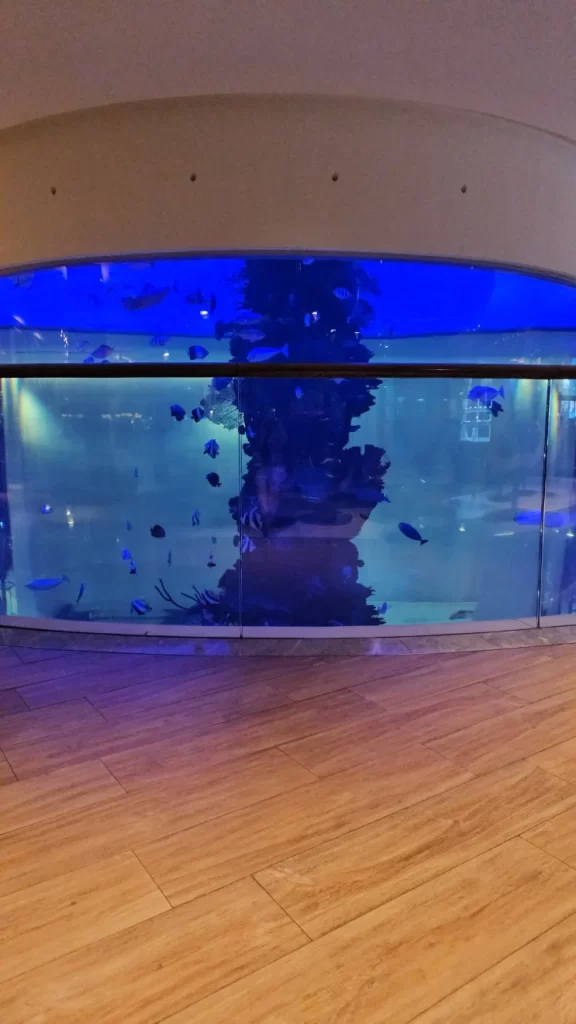 - Huge in-lobby aquarium tank with fish swimming overhead.
