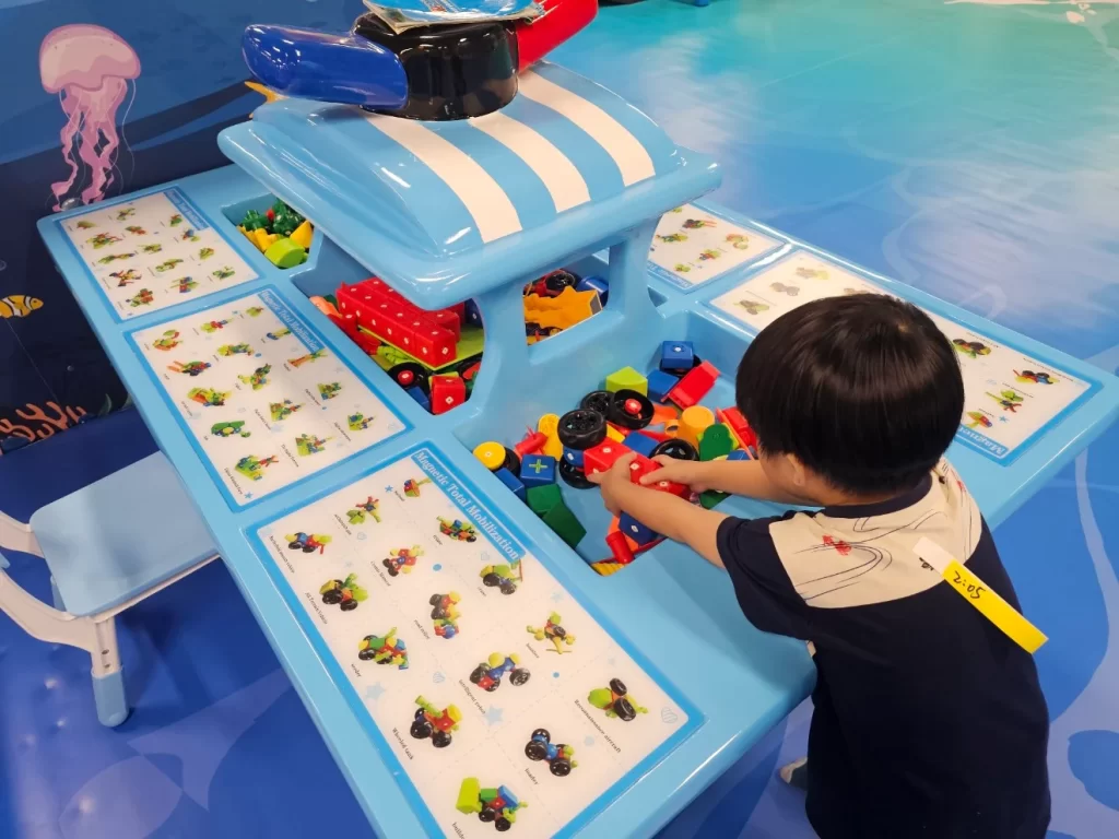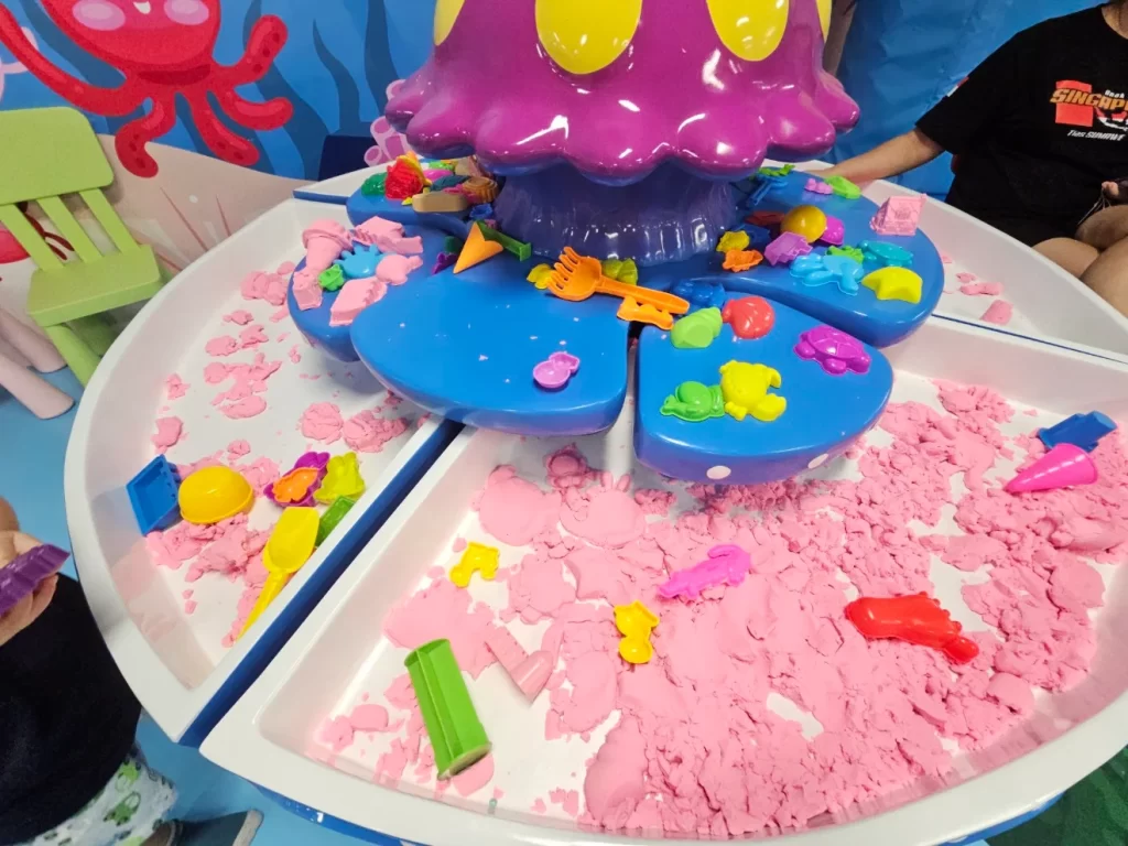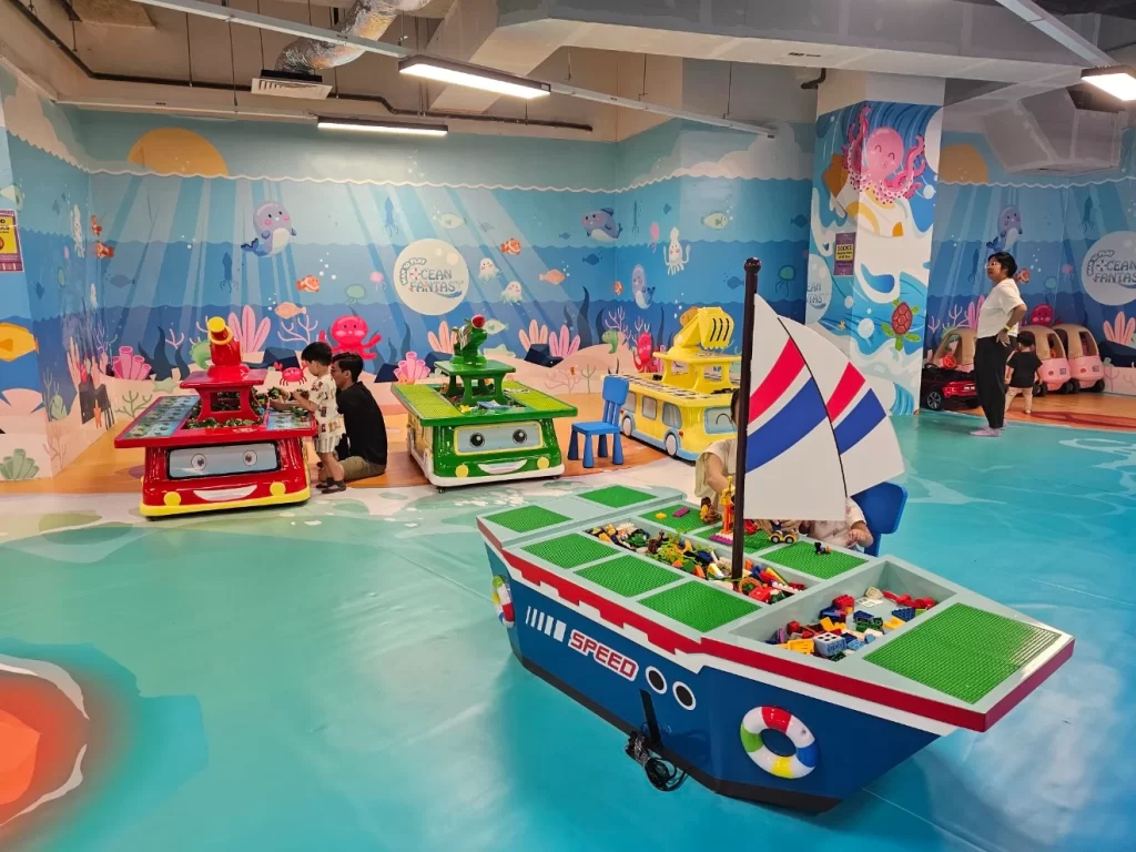 Sensory Play Areas: There are zones that allow children to engage in tactile experiences, enhancing their sensory development. Activities include kinetic sand play and interactive light panels. There’s also a small table setup consisting of Legos, a fishing game, and toy car assembly stations. Additionally, there’s a designated area for kids to drive small ride-on cars, adding variety and excitement to the play experience.