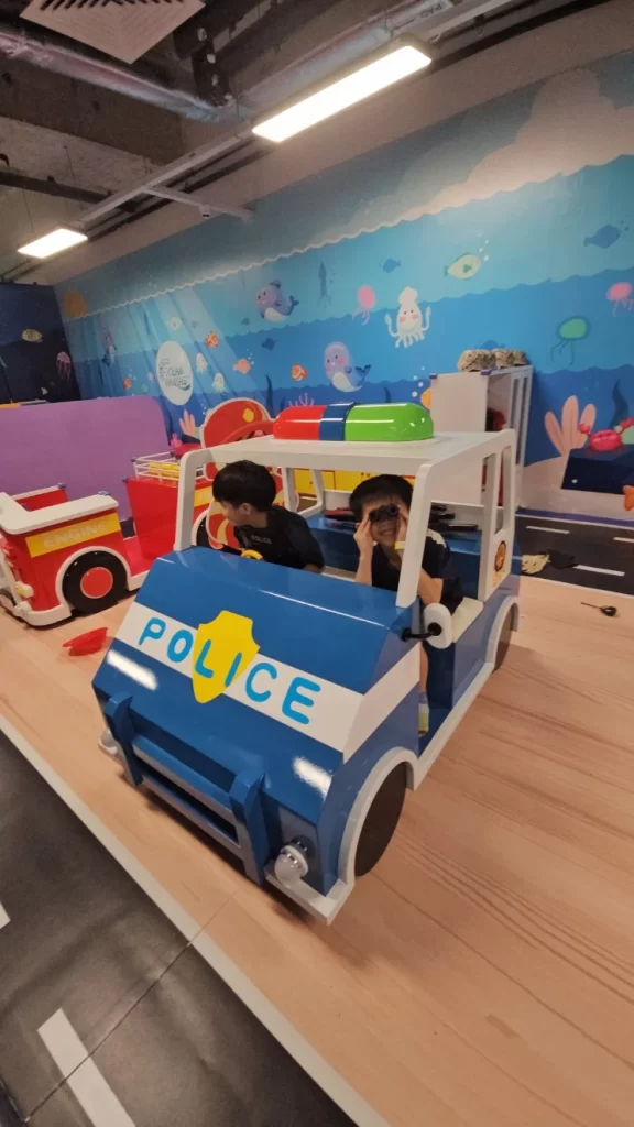 Role-Playing Zones: These areas, including a car repair shop, mini supermarket and kitchen setup, Police Station which foster creativity and social interaction as children engage in imaginative play.